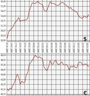 Результаты единой торговой сессии межбанковской валютной биржи показали аналогичную динамику. По итогам торгов ЕТС на ММВБ 30 марта средневзвешенный курс доллара США с расчетами "завтра" составил 34,0559 рубля, что почти на 52 копейки больше результата предыдущих торгов - 33,5362 рубля. Средневзвешенный курс евро с расчетами "завтра" снижен более чем на 9 копеек - с 45,0051 рубля до 44,9107 рубля.