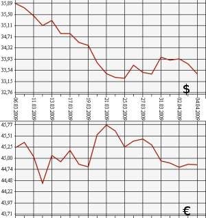 Банк России на 4 апреля 2009 года понизил официальный курс доллара США до 33,4095 рубля, а курс евро - до 44,8523 рубля. На торгах ММВБ 3 апреля средневзвешенный курс доллара с расчетами "завтра" составил 33,3825 рубля, курс евро - 44,8472 рубля.
