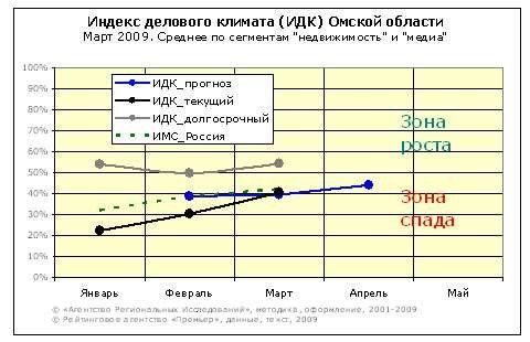 Мартовские значения ИДК для Омска практически совпали с индексами деловой активности PMI Еврозоны (40,9%), ISM index США (40,8%), а также ИМС VTB capital для России (43,9%). Все эти индексы вычисляются по сходным методикам, путем опросов менеджеров сферы услуг. Весьма показательно, что омский индекс уже три месяца подряд демонстрирует схожую динамику с индексом ИМС: непрерывный рост, что соответствует уменьшению темпов спада в экономике.