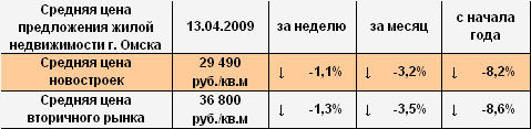 По данным журнала "Омские новостройки" (ИД "Премьер") на 13 апреля 2009 года, за прошедшую неделю стоимость одного квадратного метра жилья на первичном рынке упала на 330 рублей (-1,1%) и достигла в среднем по городу 29 тысяч 490 рублей. Таким образом, за месяц цена "квадрата" опустилась на 960 рублей (-3,2%), а с начала года - на 2640 рублей (-8,2%). За последние 12 месяцев потери рынка оцениваются в 21,5% или 8090 рублей "с метра".