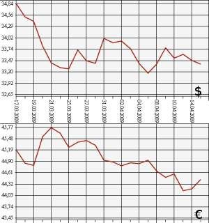 Банк России на 15 апреля 2009 года снизил официальный курс доллара США до 33,3887 рубля, а курс евро повысил до 44,4470 рубля. На торгах ММВБ 14 апреля средневзвешенный курс доллара с расчетами "завтра" составил 33,3794 рубля, курс евро - 44,3443 рубля.