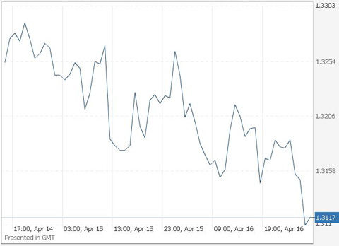 Открытие американских фондовых рынков с гэпом вверх и последующим кратковременным ростом привело к некоторому ослаблению доллара. Дополнительным обнадеживающим фактором для трейдеров стала публикация информации о том, что прибыли JP Morgan Chase and Co превысили ожидаемые значения, объем производства в Филадельфии сократился менее, чем прогнозировалось, а число первичных заявок на получение пособия по безработице в апреле также оказалось ниже предварительных оценок. Однако, влияние данных новостей на котировки "европейцев" сохранялось недолго, и после незначительного роста евро вновь продолжил падение. Дневной минимум был зафиксирован на отметке 1.3125, фунт опустился до минимума 1.4838, после чего до конца дня так и не смог подняться выше уровня 1.4940. Максимум пары доллар/франк составил уровень 1.1519. Японская иена завершила сутки выше уровня 99.30.
