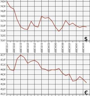 Банк России на 17 апреля 2009 года понизил официальный курс доллара США по отношению к рублю до 33,4184 рубля, а курс евро - до 44,0555 рубля. На торгах ММВБ 16 апреля средневзвешенный курс доллара с расчетами "завтра" составил 33,4084 рубля, курс евро - 44,0226 рубля.