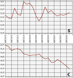 Банк России на 21 апреля 2009 года повысил официальный курс доллара США до 33,5371 рубля, а курс евро уменьшил - до 43,5613 рубля. На торгах ММВБ 20 апреля средневзвешенный курс доллара с расчетами "завтра" составил 33,6549 рубля, курс евро - 43,6649 рубля.