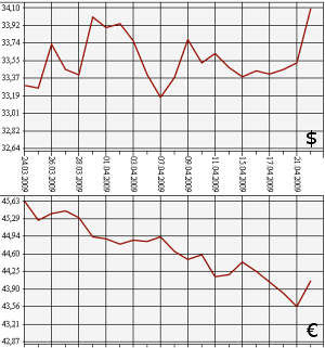 Банк России на 22 апреля 2009 года повысил официальный курс доллара США до 34,1043 рубля, а курс евро - до 44,0764 рубля. На торгах ММВБ 21 апреля средневзвешенный курс доллара с расчетами "завтра" составил 34,1242 рубля, курс евро - 44,1539 рубля.