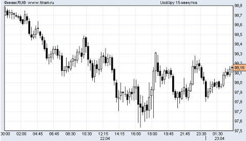 По информации www.fxclub.org, в течение торговой сессии 22 апреля котировки основных валют вели себя разнонаправленно. Японская иена получила поддержку после публикации данных, свидетельствующих о снижении темпов падения экспорта в марте (-45,6% вместо прогнозируемых -46,6%). Для инвесторов это послужило сигналом того, что рецессия скоро может достигнуть дна. По итогам дня пара доллар/иена вернулась в диапазон 97.60-98.40, достигнув трехнедельного минимума на отметке 97.55.