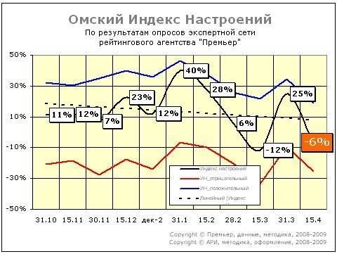 Примечание: Индексы Настроений (ИН) являются одними из важнейших индикаторов реального состояния рынка. Индекс вычисляется на основе опросов экспертов - руководителей омских компаний, аналитиков, экономистов. Они выставляют собственные оценки значимости событий рынка. В Омске регулярные замеры индекса потребительских настроений впервые стало выполнять Агентство Региональных Исследований (АРИ) в 1994-95 годах. С декабря 2008 года АРИ совместно с рейтинговым агентством "Премьер" приступили к регулярному измерению ИН на основе результатов опросов экспертной сети. Базовое значение ИН представляет собой усредненную оценку значимости текущих событий и, действительно, является индикатором настроений экспертного сообщества Омска.
