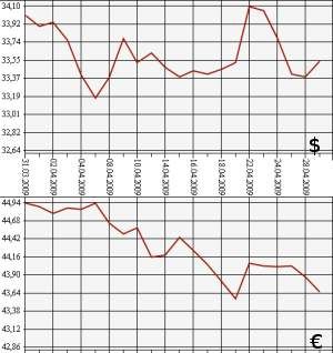 Банк России на 29 апреля 2009 года повысил официальный курс доллара США до 33,5533 рубля, а курс евро снизил до 43,6596 рубля. На торгах ММВБ 28 апреля средневзвешенный курс доллара с расчетами "завтра" составил 33,5560 рубля, курс евро - 43,6762 рубля.