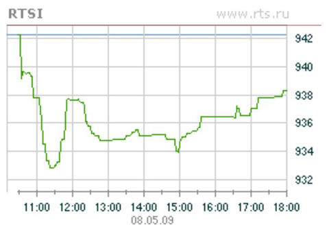 8 мая торговая сессия на российском фондовом рынке открылась и закрылась разнонаправленным движением котировок. Индекс ММВБ начал утро с роста и к концу дня достиг 1028.91 пункта (+1,7%). Зато индекс РТС с самого начала находился в зоне снижения и завершил торги на уровне 938.27, потеряв 0,34%.