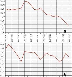 Банк России на 14 мая 2009 года снизил официальный курс доллара США до 31,9841 рубля, а курс евро - до 43,7798 рубля. На торгах ММВБ 13 мая средневзвешенный курс доллара с расчетами "завтра" составил 31,9774 рубля, курс евро - 43,6614 рубля.
