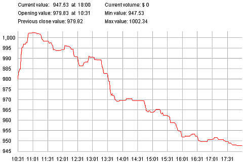 К закрытию торгов в среду индекс РТС упал на 3,3% - до 947,53 пункта. В первые часы после открытия российского рынка акций на фоне негативной информации с площадок США и Азии на РТС и ММВБ прошла первая волна распродаж. В результате к полудню индекс РТС снизился до 617,21 пункта, индекс ММВБ - до 725,71 пункта.