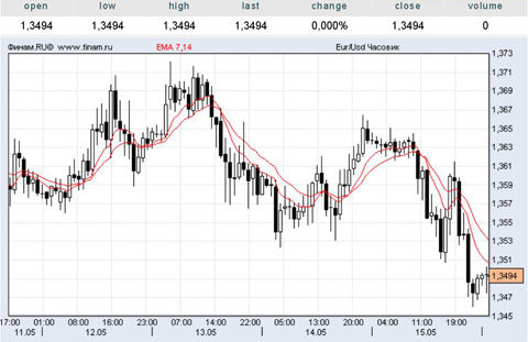 В пятницу, 15 мая, настроения участников рынка изменились. Опубликованные данные по ВВП Германии, Франции и Италии, оказались намного хуже и без того негативных прогнозных значений. Дополнительным ударом для евровалют стало падение американских фондовых индексов, а также снижение цен на нефть. Все эти события заставили инвесторов вновь обратиться к безопасным валютам. Таким образом, к концу торгов в пятницу пара евро/доллар двигалась у отметки 1,3490, фунт/доллар - у уровня 1,5170.
