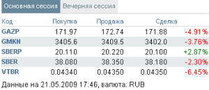 21 мая индекс РТС потерял 2,21%, индекс ММВБ - 5,51%. Лидерами понижения стали прежние лидеры роста - ВТБ и Сбербанк. По мнению экспертов, дальнейшее масштабное снижение с уходом индекса РТС ниже 1000 будет очень негативным для отечественных торговых площадок.
