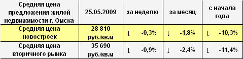 По данным журнала "Недвижимость" (ИД "Премьер") на 25 мая 2009 года, за прошедшую неделю стоимость одного квадратного метра жилья на первичном рынке упала на 100 рублей (-0,3%) и достигла в среднем по городу 28 тысяч 810 рублей. За месяц цена "квадрата" опустилась на 520 рублей (-1,8%), а с начала года - на 3320 рублей (-10,3%). За последние 12 месяцев потери рынка оцениваются в 22,8% или 8500 рублей "с метра".