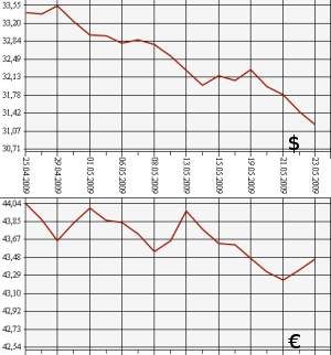 Банк России на 23 мая 2009 года снизил официальный курс доллара США по отношению к рублю до 31,1998, а курс евро повысил до 43,4644. На торгах ММВБ 22 мая средневзвешенный курс доллара с расчетами "завтра" составил 31,1791 рубля, евро - 43,5067 рубля.