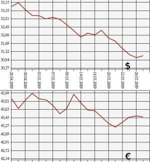 Банк России на 27 мая 2009 года повысил официальный курс доллара США по отношению к рублю до 31,1465 рубля, а курс евро снизил - до 43,4712 рубля. На торгах ММВБ 26 мая обе валюты выросли: средневзвешенный курс доллара с расчетами "завтра" - до 31,3711 рубля, курс евро - до 43,6505 рубля.
