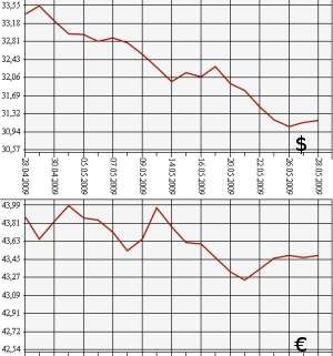 Банк России на 28 мая 2009 года повысил официальный курс доллара США до 31,1846 рубля, а курс евро - до 43,4963 рубля. На торгах ММВБ 27 мая средневзвешенный курс доллара с расчетами "завтра" составил 31,1629 рубля, курс евро - 43,4858 рубля.