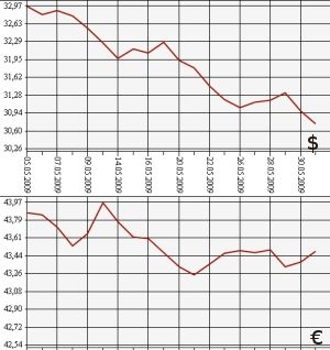 С началом лета тенденция последних дней мая не изменились - "зеленый" продолжает дешеветь, а курс европейской валюты, напротив, растет. По данным Центробанка, на 2 июня официальный курс доллара США понижен чуть более чем на 24 копейки - с 30,9843 рубля до 30,7441 рубля. Таким образом за последний месяц достигнут локальный минимум по отношению к рублю. Официальный курс евро к рублю снова повышен – почти на 11 копеек (с 43,3780 рубля до 43,4875 рубля). Стоимость бивалютной корзины (0,45 евро и 0,55 доллара) понизилась более чем на 8 копеек - с 36,5615 рубля до 36,4786 рубля.