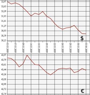 Банк России на 3 июня понизил официальный курс доллара США до 30,7321 рубля, а курс евро - до 43,4152 рубля. На торгах ММВБ 2 июня средневзвешенный курс доллара с расчетами "завтра" составил 30,7033 рубля, курс евро - 43,4901 рубля. Стоимость обеих главных валют пошла на спад. По данным Центробанка, на 3 июня официальный курс евро понижен почти на 7 копеек -с 43,4875 рубля до 43,4152 рубля. Официальный курс доллара США также понижен - чуть более чем на 1 копейку, с 30,7441 рубля до 30,7321 рубля. Таким образом, и стоимость бивалютной корзины (0,45 евро и 0,55 доллара) понизилась почти на 4 копейки - с 36,4786 рубля до 36,4395 рубля.