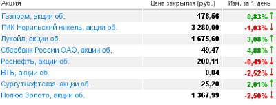 В лидерах роста оказались бумаги Сбербанка и "ЛУКОЙЛа", прибавившие 4,87% и 3,07% соответственно. По остальным "фишкам" наблюдался менее выраженный рост. Металлургические компании по итогам дня ушли в "минус": ГМК "Норильский Никель" (-1,03%), "Северсталь" (-1,52%), ММК (-1,05%), НЛМК (-3,49%).