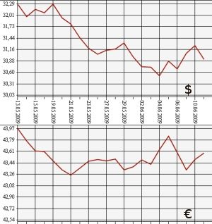 Банк России на 11 июня 2009 года понизил официальный курс доллара США до 30,9277 рубля, а курс евро повысил до 43,5895 рубля. На торгах ММВБ 10 июня средневзвешенный курс доллара с расчетами "завтра" составил 30,8913 рубля, курс евро - 43,5496 рубля.