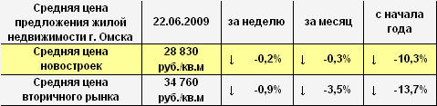 По данным журнала "Недвижимость" (ИД "Премьер") на 22 июня 2009 года, за прошедшую неделю стоимость одного квадратного метра жилья на первичном рынке упала на 60 рублей (-0,2%) и достигла в среднем по городу 28 тысяч 830 рублей. Таким образом, за месяц цена "квадрата" опустилась на 80 рублей (-0,3%), а с начала года - на 3300 рублей (-10,3%). За последние 12 месяцев потери рынка оцениваются в 20,6% или 7470 рублей "с метра".