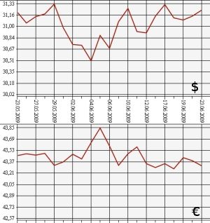 Банк России на 23 июня понизил курс курс евро до 43,3216 рубля, а доллара США - повысил до 31,2408 рубля. На торгах ЕТС ММВБ 22 июня средневзвешенный курс доллара с расчетами на "завтра" составил 31,2884 рубля, курс евро - 43,3707 рубля.