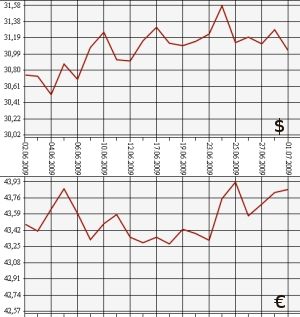 Центробанк на 1 июля понизил официальный курс доллара США более чем на 25 копеек - с 31,2904 рубля до 31,0385 рубля. Официальный курс евро повышен - более чем на 3 копейки (с 43,8191 рубля до 43,8512 рубля). Стоимость бивалютной корзины (0,45 евро и 0,55 доллара) упала более чем на 12 копеек - с 36,9283 рубля до 36,8042 рубля. За месяц доллар вырос на 29 копеек, а евро - более чем на 36 копеек.