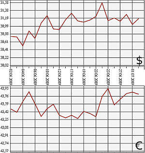 На торгах ММВБ наблюдалась такая же динамика. Средневзвешенный курс доллара США с расчетами "завтра" по итогам ЕТС ММВБ вырос на 11 копеек - с 31,0549 рубля до 31,1648 рубля. Средневзвешенный курс евро с расчетами "завтра" понизился почти на 2 копейки - с 43,8535 рубля до 43,8340 рубля.