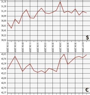 По итогам единой торговой сессии ММВБ 2 июля курс евро с расчетами "завтра" вырос более чем на 3 копейки - с 43,8340 рубля до 43,8651 рубля. Средневзвешенный курс доллара США составил 31,1482 рубля, что на полторы копейки меньше результата торгов 1 июля (31,1648 рубля).