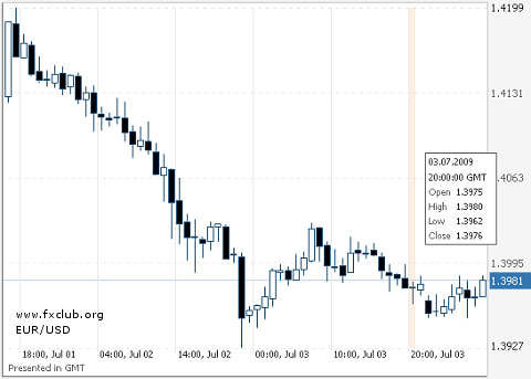 Как сообщает www.fxclub.org, 3 июля рынки в США были в связи с Днем независимости. В самом начале торговой сессии пятницы на фоне негативных ожиданий произошло резкое укрепление доллара, в результате которого евро и фунт откатились до недельных минимумов, 1.3927 и 1.6301, соответственно. С открытием торгов в Европе единой валюте удалось частично восстановиться и подняться выше отметки 1.4000. Однако, после выхода данных о сокращении объема розничной торговли Еврозоны за май больше ожидаемого рост сменился снижением.