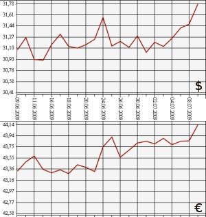 Банк России на 9 июля повысил официальный курс евро по отношению к рублю до 44,1387 рубля, а курс доллара США - до 31,7819 рубля. На торгах ММВБ средневзвешенный курс евро с расчетами "завтра" вырос до 44,1684 рубля, курс доллара - до 31,7665 рубля. По данным ЦБ РФ, на 9 июля официальный курс евро к рублю увеличен более чем на 28 копеек - с 43,8559 рубля до 44,1387 рубля. Официальный курс доллара США также стал выше - более чем на 31 копейку (с 31,4695 рубля до 31,7819 рубля). Для обеих валют сегодняшний "результат" стал рекордным за последний месяц. Соответственно, стоимость бивалютной корзины (0,45 евро и 0,55 доллара) увеличилась до 37,3424 рубля, что почти на 30 копеек выше цены 8 июля.