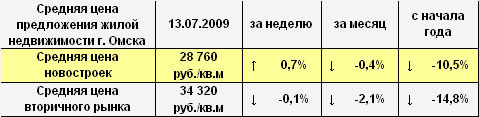 По данным журнала "Недвижимость" (ИД "Премьер") на 13 июля 2009 года, за прошедшую неделю стоимость одного квадратного метра жилья на первичном рынке возросла на 190 рублей (+0,7%) и достигла в среднем по городу 28 тысяч 760 рублей. За месяц цена "квадрата" опустилась на 130 рублей (-0,4%), а с начала года - на 3370 рублей (-10,5%). За последние 12 месяцев потери рынка оцениваются в 19,6% или 7030 рублей "с метра".
