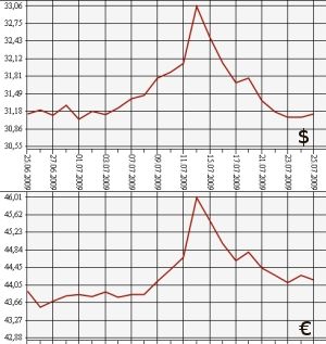 По данным ЦБ РФ, 25 июля официальный курс доллара США к рублю повышен более чем на 6 копеек - с 31,0760 рубля до 31,1372 рубля. Официальный курс евро, напротив, понижен более чем на 10 копеек - с 44,2771 рубля до 44,1712 рубля. Бивалютная корзина (0,45 евро и 0,55 доллара) "похудела" чуть более чем на 1 копейку - с 37,0165 рубля до 37,0025 рубля.