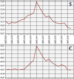ЦБ РФ на 29 июля понизил курс евро до 43,7675 рубля, курс доллара США - до 30,6431 рубля. Стоимость бивалютной корзины понизилась до 36,5491 рубля. На ММВБ средневзвешенный курс доллара США с расчетами "завтра" вырос до 30,7556 рубля, курс евро - до 43,8386 рубля.