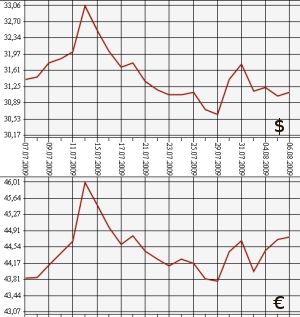 По данным Банка России, на 6 августа официальный курс доллара США к рублю повышен более чем на 8 копеек - с 31,0484 рубля до 31,1326 рубля. Официальный курс евро также увеличился - более чем на 6 копеек, с 44,7097 рубля до 44,7780 рубля. Стоимость бивалютной корзины (0,45 евро и 0,55 доллара) выросла более чем на 7 копеек - с 37,1960 рубля до 37,2731 рубля.