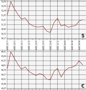 По данным ЦБ РФ, на 11 августа официальный курс доллара США к рублю повышен более чем на 10 копеек - с 31,5473 рубля до 31,6503 рубля. Официальный курс евро, напротив, понижен - почти на 34 копейки (с 45,2893 рубля до 44,9498 рубля). Стоимость бивалютной корзины (0,45 евро и 0,55 доллара) уменьшилась более чем на 9 копеек - с 37,7312 рубля до 37,6351 рубля.