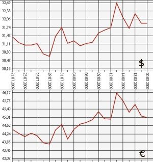 Банк России 20 августа понизил официальный курс евро к рублю до 45,0123 рублей, а курс доллара США, напротив, повысил - до 31,9191 рубля. На торгах ММВБ средневзвешенный курс доллара с расчетами "завтра" составил 31,9489 рубля, курс евро - 45,0808 рубля.По данным ЦБ РФ, на 20 августа официальный курс доллара США незначительно повышен - менее чем на копейку. Стоимость американской валюты составила 31,9191 рубля, поднявшись с 31,9187 рубля 19 августа. Официальный курс евро к рублю, напротив, понижен - более чем на 7 копеек (с 45,0884 рубля до 45,0123 рубля). Бивалютная корзина (0,45 евро и 0,55 доллара) подешевела более чем на 3 копейки - с 37,8451 рубля до 37,8110 рубля.