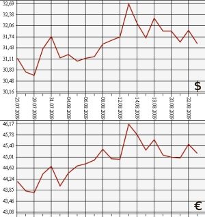 По данным Центробанка, на 25 августа официальный курс доллара США понижен почти на 39 копеек - с 31,9443 рубля до 31,5544 рубля. Официальный курс евро к рублю также уменьшен - более чем на 31 копейку (с 45,4663 рубля до 45,1512 рубля). Бивалютная корзина (0,45 евро и 0,55 доллара) подешевела более чем на 35 копеек - с 38,0292 рубля до 37,6729 рубля.