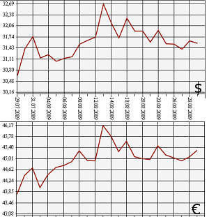 По итогам торгов на ЕТС ММВБ 28 августа, средневзвешенный курс евро с расчетами "завтра" на торгах ЕТС ММВБ вырос на 18 копеек - с 45,1067 рубля до 45,2920 рубля. Средневзвешенный курс доллара США с расчетами "завтра" понизился почти на 14 копеек - с 31,6345 рубля на предыдущих торгах до 31,5641 рубля.