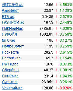 В RTS Standard акции "ЛУКОЙЛа" подорожали на 6,87%, "Роснефти" - на 3,26%, "Газпрома" - на 2,61%. Лидерами по объему торгов (2.008 млрд руб.) стали акции Сбербанка, по числу сделок (4852) - акции "Газпрома". индекс РТС к закрытию торгов снизился на 1,99% - до 1091.76 пункта. Индекс ММВБ вырос на 2,61% - до 1108.2 пункта.