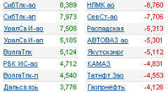 Как отмечают аналитики "Атона", некоторые представители "голубых фишек", вопреки негативным настроениям на рынке, сумели обновить вчерашние максимумы. Вновь продемонстрировал позитивную динамику телекоммуникационный сектор: привилегированные и обыкновенные акции "Сибирьтелекома" подорожали на 8% и 8,39%, соответственно, "Уралсвязьинформ" прибавил 7,51%, "ВолгаТелеком" - +5,12%.
