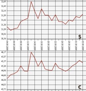 Результаты единой торговой сессии межбанковской валютной биржи показали аналогичную динамику. По итогам торгов ЕТС на ММВБ 2 сентября, средневзвешенный курс доллара США с расчетами "завтра" составил 31,9692 рубля, что более чем на 18 копеек выше результата предыдущих торгов (31,7837 рубля 1 сентября). Средневзвешенный курс евро уменьшился более чем на 10 копеек - с 45,5701 рубля до 45,4679 рубля.