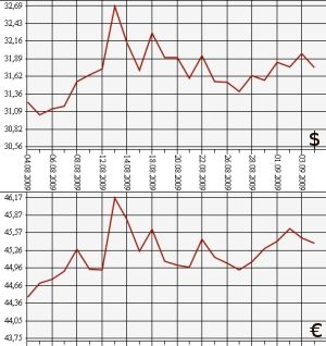 Результаты единой торговой сессии межбанковской валютной биржи показали аналогичную динамику. По итогам торгов ЕТС на ММВБ 3 сентября, средневзвешенный курс доллара США с расчетами "завтра" упал более чем на 24 копейки - с 31,9692 рубля до 31,7233 рубля. Средневзвешенный курс евро составил 45,3504 рубля, потеряв почти 12 копеек от предыдущего результата торгов - 45,4679 рубля 2 сентября.