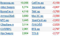 В RTS Standard лидерами снижения котировок стали обыкновенные акции ВТБ (-3,04%), акции ЛУКОЙЛа (-3,13%) и "Газпрома" (-2,36%). На ММВБ значительнее всего упали акции "Лукойла" (-2,8%) и "Уралкалия" (-3,8 %). В положительной зоне закрылись Сбербанк (а.п. - +3,1%) и МТС (+3,4%).