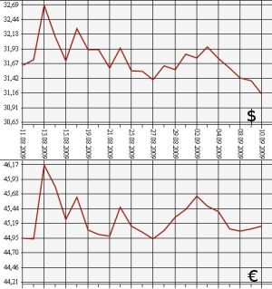 Результаты единой торговой сессии межбанковской валютной биржи показали нескольку иную динамику. По итогам торгов ЕТС на ММВБ 9 сентября, средневзвешенный курс доллара США с расчетами "завтра" упал более чем на 19 копеек – с 31,3458 рубля до 31,1491 рубля. Средневзвешенный курс евро также стал ниже более чем на 9 копеек, снизившись с 45,2719 до 45,1815 рубля.