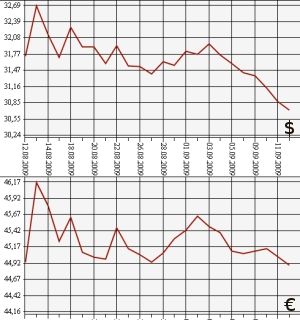 Результаты единой торговой сессии межбанковской валютной биржи показали аналогичную динамику. По итогам торгов ЕТС на ММВБ 11 сентября, средневзвешенный курс доллара США с расчетами "завтра" упал более чем на 14 копеек - с 30,8727 рубля до 30,7254 рубля. Средневзвешенный курс евро также стал ниже - более чем на 8 копеек, с 44,9558 рубля до 44,8685 рубля.