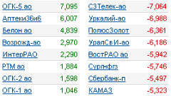 На фоне падения цен на нефть бумаги сырьевых и нефтегазовых компаний торговались в "красной зоне": Уралкалий" (-7%), "Уралсвязьинформ" (-6%), "Сургутнефтегаз" (-5%), "Татнефть" (-5%), "Новатэк" (-4%). Бумаги "Полюс Золота" снизились более чем на 6% на фоне падения цен на золото ниже 1000 долларов за унцию. В бумагах ТЭК наблюдались локальные покупки. Снижались и банки: в RTS Standard обыкновенные акции Сбербанка упали на 5,3% до 55,35 рубля, обыкновенные акции ВТБ - на 2,79% до 0,0557 рубля. На ММВБ бумаги Сбербанка упали на 4,07% до 55,34 рубля, ВТБ - на 2,8% до 0,0555 рубля.