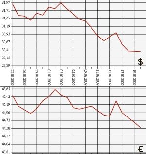 По данным ЦБ РФ, 22 сентября официальный курс доллара США к рублю понижен менее чем копейку - с 30,3744 рубля до 30,3711 рубля. Официальный курс евро также уменьшен - более чем на 15 копеек, с 44,6807 рубля до 44,5271 рубля. Соответственно, стоимость бивалютной корзины (0,45 евро и 0,55 доллара) сократилась на 7 с лишним копеек - с 36,8122 рубля до 36,7413 рубля.