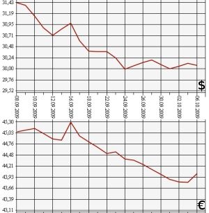 Центробанк на 6 октября 2009 года понизил курс доллара США до 30,0785 рубля, а курс евро, напротив, повысил - до 44,0259 рубля. На торгах ЕТС ММВБ средневзвешенный курс доллара с расчетами "завтра" упал до 30,0761 рубля, курс евро вырос до 43,9833 рубля.